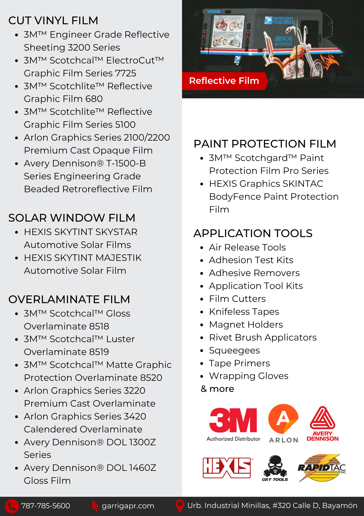 Wrapping Film: 3M™ Wrap Film Series 2080, Avery Dennison® Supreme Wrapping™ Film SW900, HEXIS Graphics SKINTAC Cast PVC Film, 3M™ Controltac™ Graphic Film IJ1803M™, Scotchlite™ Reflective Graphic Film IJ680, Arlon Graphics CalWrap™ High Performance Digital Film with FLITE Technology™, Arlon Graphics SLX®/SLX®+ Cast Wrap, Avery Dennison® MPI 1105 Wrapping Series